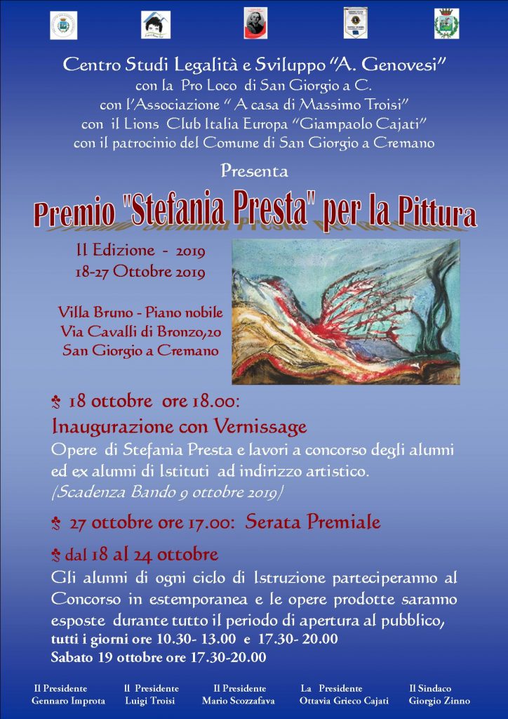 Si svolgerà dal 18 al 24 ottobre, nella splendida cornice di Villa Bruno a San Giorgio a Cremano, al piano nobile, la 2^ edizione del Premio di pittura dedicato all’artista Stefania Presta, prematuramente scomparsa.
