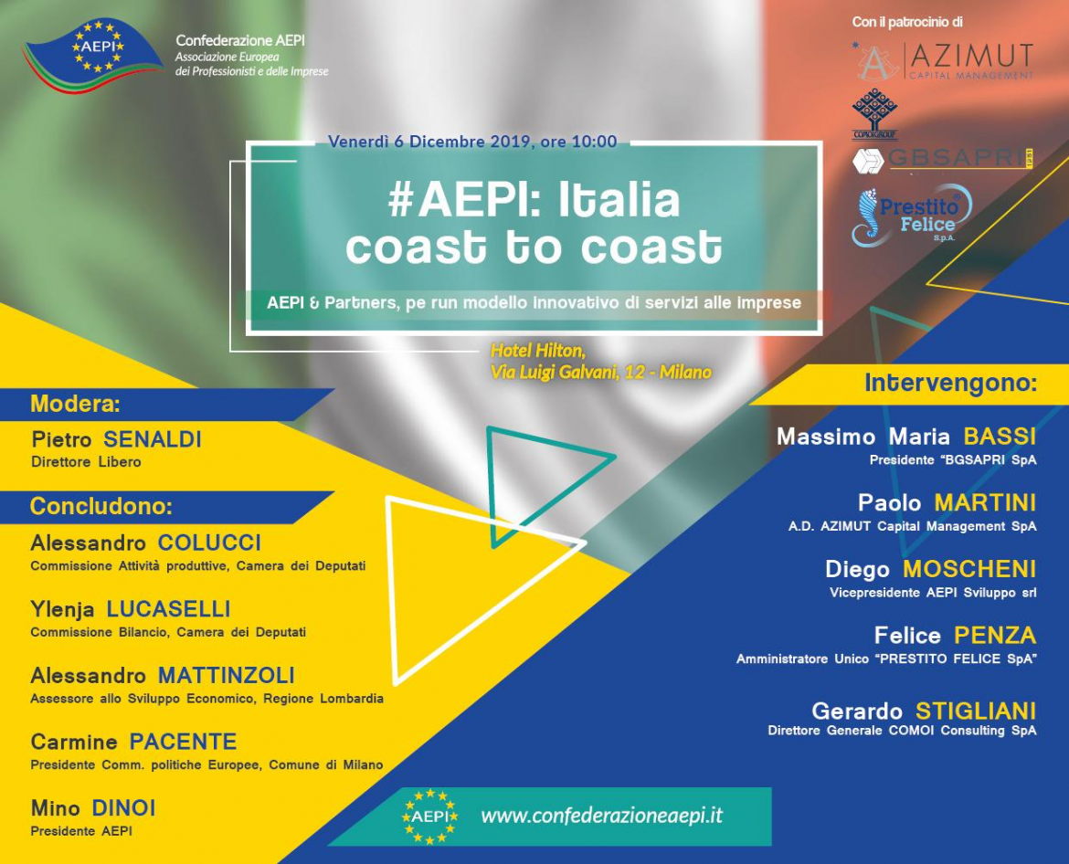 Il tour “AEPI: Italia coast to coast” sbarcherà a Milano venerdì 6 Dicembre, in via Galvani 12. L’Associazione Europea dei Professionisti e delle Imprese ha infatti organizzato un convegno, in collaborazione con Azimut, sul credito alle Imprese.