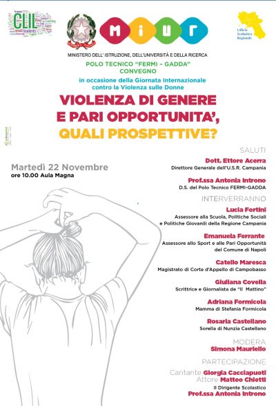 Interverranno: Ettore Acerra, Direttore Generale dell’U.S.R. Campania, Lucia Fortini, Assessore alla Scuola della Regione Campania, Emanuela Ferrante, Assessore alle Pari Opportunità del Comune di Napoli. A dialogare con gli alunni saranno Catello Maresca, Magistrato di Corte d’Appello di Campobasso, Giuliana Covella, Giornalista e Scrittrice e i familiari delle vittime di femminicidio Stefania Formicola e Nunzia Castellano. Lettura di alcuni brani dei libri dedicati alle due vittime a cura degli alunni.