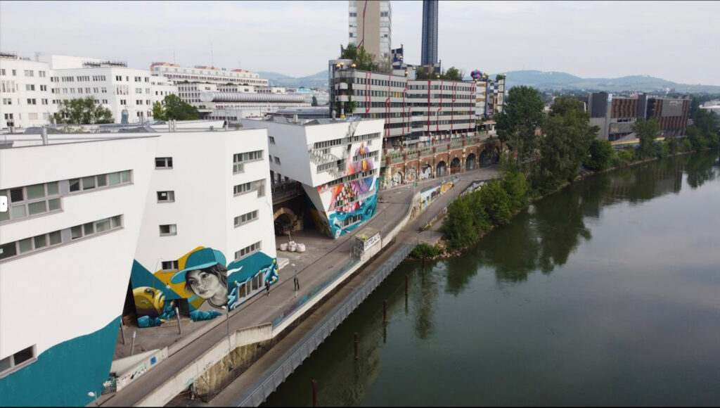 Fu all’inizio degli anni Novanta che il Comune di Vienna iniziò a riqualificare questa sponda fluviale e incaricò Zaha Hadid di sviluppare nuove idee per il lotto situato tra il fiume e il tratto dismesso del viadotto ferroviario. Nel 1994 Zaha Hadid elaborò il progetto con disegni di grande effetto e lo presentò nella rinomata galleria d’arte di Grita Insam. La proposta iniziale comprendeva cinque edifici curvilinei che si proiettavano a sbalzo sopra il viadotto. Erano previsti 15 lussuosi appartamenti affacciati sul Donaukanal, con atelier per artisti, uffici, caffè e negozi. La società immobiliare SEG lo acquisì ma fu approvato con solo tre corpi per una superficie netta di circa 3.200 mq. Al posto degli esclusivi loft furono previsti 29 piccoli alloggi da dare in affitto per brevi periodi. Nel 2005 i lavori furono terminati e l’anno dopo entrarono i primi affittuari. A questo scopo la progettista ha dovuto aumentare i pilastri, ridurre le aperture e le finiture economiche, così da definire l’opera un “disegno stracciato”. Purtroppo la SEG, che stava sviluppando anche altri progetti per la città, andò in fallimento e, scaduti i contratti di locazione, gli edifici rimasero vuoti per un po’. Probabilmente l’insuccesso fu determinato dal genere di appartamenti con costo di locazione molto alto e con spazi particolarmente difficili da arredare; per di più in una zona che non era stata ancora rivitalizzata. Due anni dopo La SEG venne ricostituita occupando in parte il complesso con i suoi uffici. Nacque l’idea di offrire alloggi in affitto agli infermieri, data la vicinanza con l’Ospedale e agli studenti grazie alla presenza universitaria della Facoltà di Medicina. Conseguentemente sono state prese in considerazione alcune funzioni socialmente utili: un bio-mercato ecologico, degli alloggi per senzatetto, alcuni spazi per associazioni caritative, e così via. Tra il 2019 e il 2020 la proprietà è passata a un nuovo investitore che ha riproposto gli alloggi a breve termine sotto il logo Urban Island. Le piante degli edifici sono state riadattate e le facciate astratte di Hadid si sono ricoperte di murales che pubblicizzano le nuove residenze.