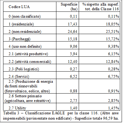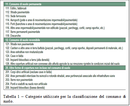 La classificazione avviene attraverso la distinzione di 3 macro categorie: 1) consumo di suolo permanente, quando la copertura è irreversibile e causa impermeabilizzazione (es. edifici, strade e piazzali asfaltate, ecc.); 2) consumo di suolo reversibile, quando la copertura può essere rimossa, pur causando la distruzione o la perdita di funzionalità del suolo (es. cantieri, impianti fotovoltaici a terra, aree estrattive); 3) Altre forme di coperture non incluse nel consumo di suolo (es. serre non pavimentate, infrastrutture come ponti e viadotti, ecc.). La classificazione dettagliata di quanto utilizzato viene riportata in Tabella 1.