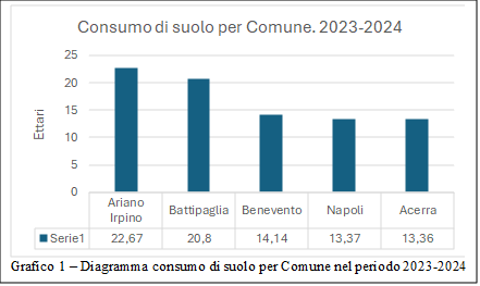 Nel periodo di riferimento il comune che ha consumato più suolo è quello di Ariano Irpino (22,67 ettari), interessato dalla costruzione della linea ferroviaria dell’Alta velocità Napoli-Bari e sede di una nuova stazione ferroviaria (Foto 1). Seguono i comuni di Battipaglia, Benevento, Napoli ed Acerra.