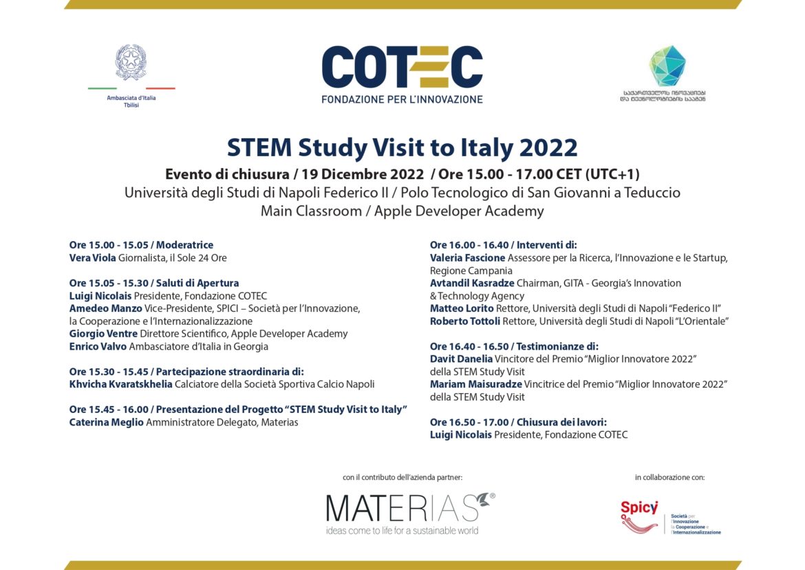 Si terrà lunedì 19 dicembre, a Napoli, l’evento conclusivo dell’edizione 2022 di STEM Study Visit to Italy. Una full immersion nella digital transformation con Davit Danelia e Mariam Maisuradze, due giovani innovatori georgiani, promossa dalla Fondazione Cotec e da Gita – Georgia’s Innovation and Technology Agency, in collaborazione con l’Ambasciata d’Italia a Tbilisi. Obiettivo: rafforzare l’esperienza degli innovatori georgiani nel campo della ricerca tecnico-scientifica e consolidare ed espandere la collaborazione a sfondo tecnologico tra Italia e Georgia.