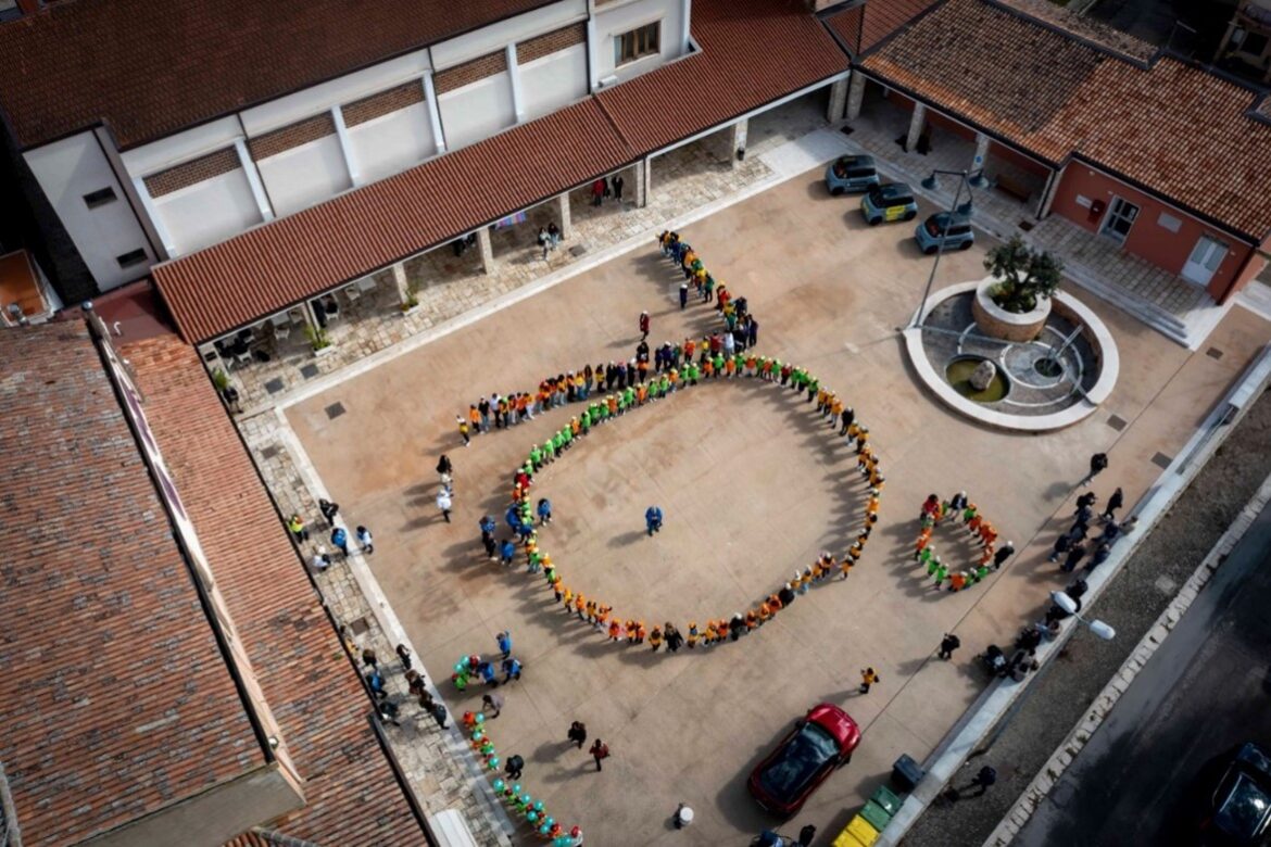 - l’albero, “il carrubo”, rappresenta un omaggio al mondo contadino che ha vissuto la creazione del borgo nel lontano 1953. Al tempo stesso, quest’albero simboleggia, da un lato, il legame tra generazioni che viene trasmesso dai genitori ai figli, ai nipoti mentre dall’altro quello tra maestri e allievi;