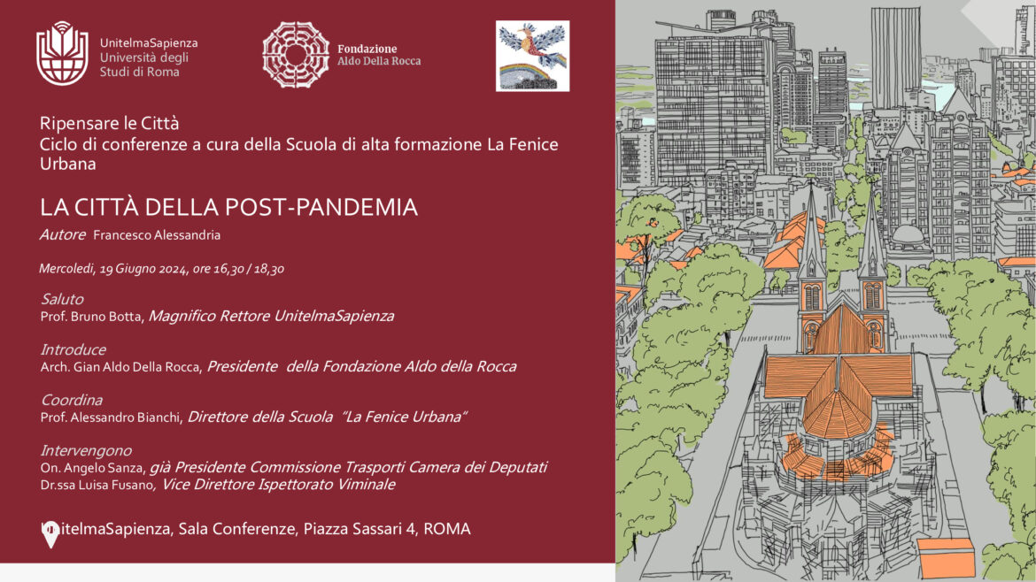 Il 19 giugno scorso, presso la sala conferenze di UnitelmaSapienza, nell’ambito del nuovo ciclo di seminari organizzato dalla Scuola “La Fenice Urbana” è stato presentato il libro di Francesco Alessandria: LA CITTÀ DELLA POST-PANDEMIA – I servizi di prossimità verso la rigenerazione nella smart city.