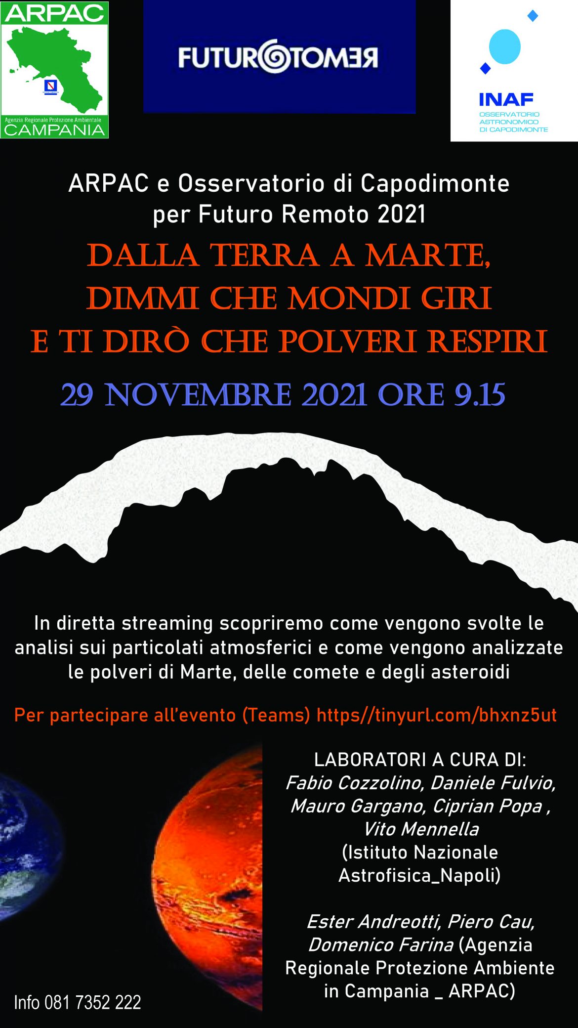 Nell’ambito dell’iniziativa Futuro Remoto, l’Arpa Campania è stata coinvolta insieme all’Osservatorio di Capodimonte per offrire un contributo relativo alle attività che due Enti così diversi portano avanti sulle polveri.