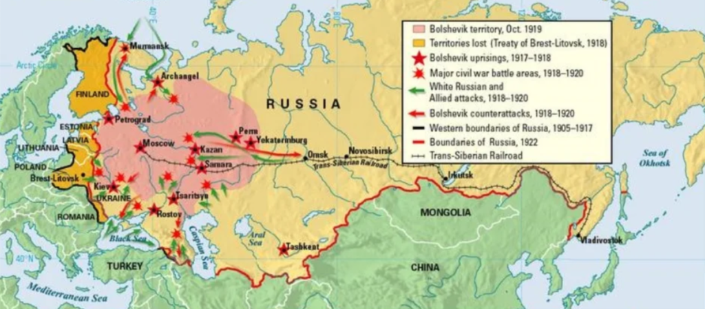 Nel 1922, con la sconfitta delle ultime sacche di resistenza nell’Estremo Oriente e in Siberia, la guerra civile poté dirsi conclusa. La Russia usciva devastata: milioni di morti, città e campagne distrutte, carestie e un tessuto sociale lacerato. Ma i bolscevichi avevano ottenuto ciò che più contava: il monopolio assoluto del potere.