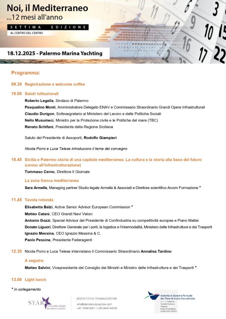 “Traffici marittimi, nuovi collegamenti, attrazione di investimenti e insediamento di attività produttive, all’interno di un quadro normativo orientato al mercato, saranno i temi al centro dell’incontro ‘Noi, il Mediterraneo’, il 18 dicembre a Palermo”.