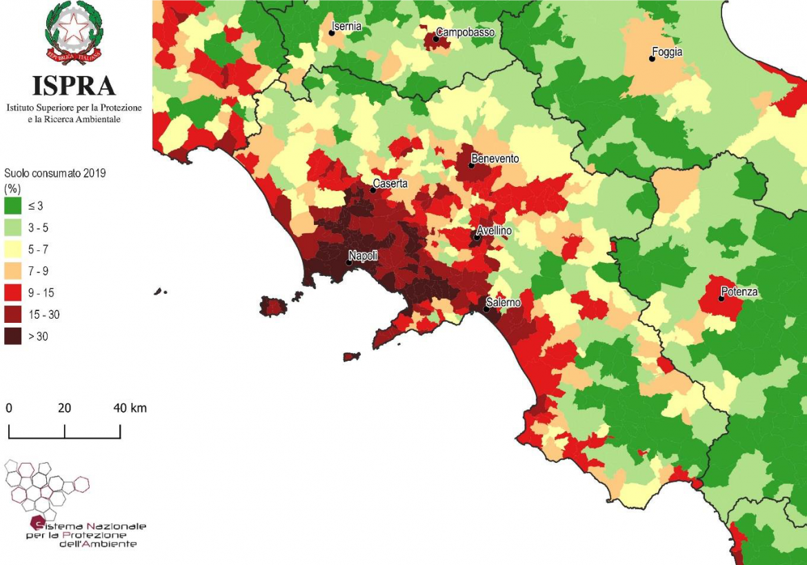 La Campania non è messa malissimo. Presenta un incremento di consumo netto pro capite di circa 200 mq. a fronte di una media nazionale di circa 350. Lo 0,1% contro lo 0,3% nazionale. In termini assoluti il suolo consumato al 2019 è di 140.033 ettari, pari al 10,30% della superficie. Note dolenti per Casavatore, Arzano e Melito che presentano una percentuale di aree coperte del 90% nel primo caso e dell’80% negli altri due. Napoli è al 63%.
