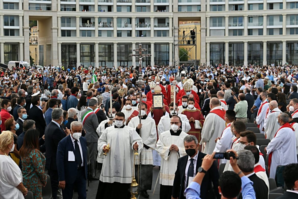 Migliaia in piazza per San Matteo. La fede ha chiamato e i salernitani hanno risposto. Poco importa che anche quest’anno il Covid ci abbia messo lo zampino impedendo al Santo Patrono di Salerno di sfilare per le vie del centro. La tradizione, rivisitata, si è ripetuta. E se San Matteo non può andare dai salernitani sono i salernitani che vanno da San Matteo. Tutti in fila, muniti di Green Pass. Nella nuova e grande Piazza della Libertà, inaugurata il giorno prima dal presidente della Campania Vincenzo De Luca, il 21 settembre si è tenuto il solenne pontificale officiato da monsignor Parolin, segretario di Stato Vaticano. Il cardinale si è detto commosso per l’amore che i cittadini hanno dimostrato per il loro Santo Patrono e ha augurato alla città “che questa celebrazione possa davvero rappresentare un segno di ripresa e di speranza”. Tantissimi i fedeli che hanno partecipato all’evento.