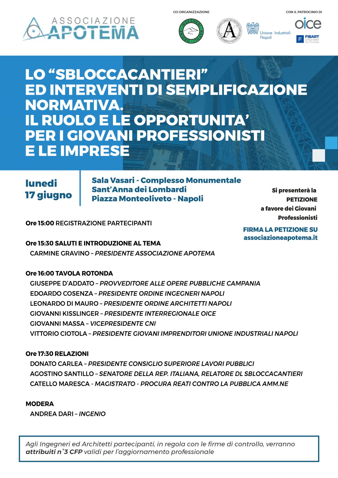 Ci proveranno il prossimo lunedì 17 giugno a Napoli, a Sant’Anna dei Lombardi, il Presidente del Consiglio Superiore dei Lavori Pubblici, Donato Carlea, il Senatore Agostino Santillo, relatore del decreto, e il sostituto procuratore Catello Maresca del pool reati contro la Pubblica Amministrazione.
