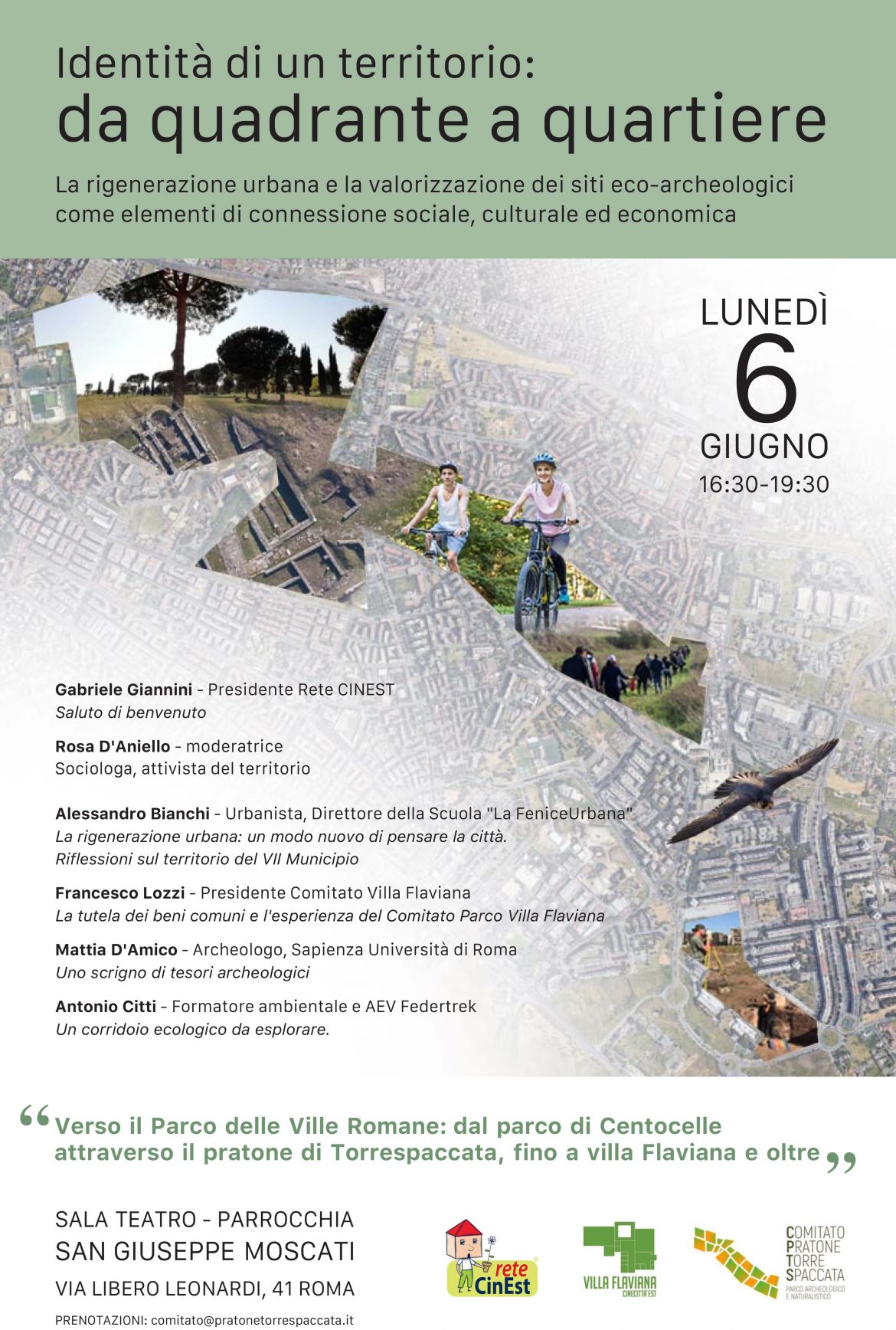 Il Comitato per il Pratone di Torre Spaccata, la Rete CINEST e il Comitato per il Parco Villa Flaviana organizzano il seminario “Identità di un territorio: da quadrante a quartiere”, che si terrà il 6 giugno alle ore 16.30 presso la Sala Teatro della Parrocchia San Giuseppe Moscati (Via Libero Leonardi, 41 Roma) nel Municipio VII.