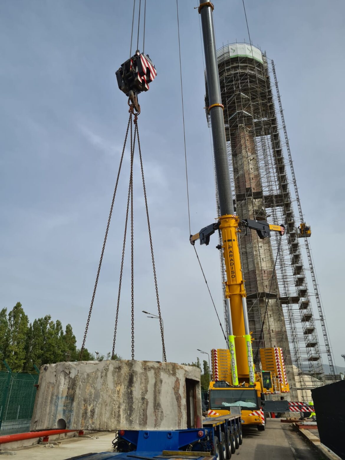 “Rinforzata da quattro speroni a larghezza decrescente, sulla sommità della torre è presente il serbatoio di forma toroidale che ospitava l’acqua industriale dell’impianto, con una capacità di 280 metri cubi. La struttura è stata sostituita con un nuovo sistema di approvvigionamento idrico, funzionale ai lavori di dismissione in corso. La tecnica impiegata per la demolizione è il taglio a filo diamantato, eseguito con l’ausilio di una gru. Il taglio avviene dall’alto verso il basso e prevede il progressivo sezionamento della struttura in blocchi di cemento armato, ciascuno con peso inferiore a 10 tonnellate”.