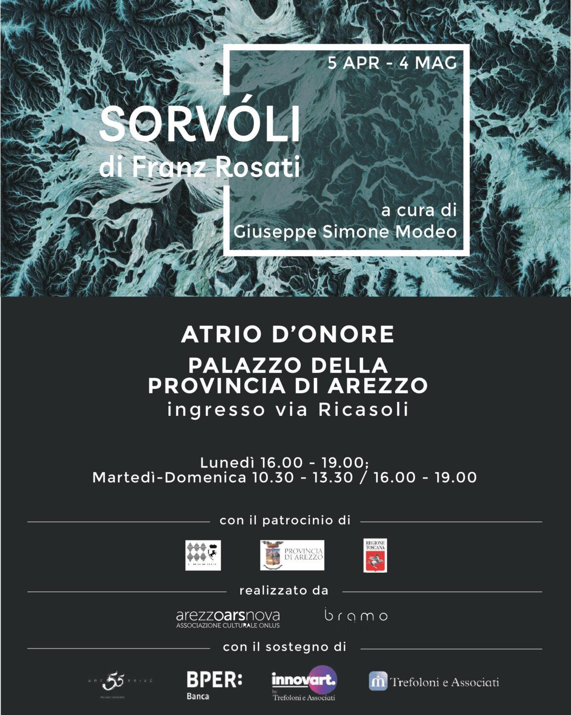 Dal 5 aprile al 4 maggio – inaugurazione il 4 aprile – tra immagini dal satellite e suoni da algoritmi al palazzo della provincia di Arezzo. I “Sorvóli” sul mondo iperconnesso di Franz Rosati. Una installazione di arte digitale assemblata con immagini satellitari, visualizzazioni elaborate utilizzando modelli di machine learning e spazi virtuali generati dall’analisi delle informazioni recuperate dai veicoli spaziali in orbita intorno alla Terra, e basata sui progetti “Latentscape” e “Distantia”.