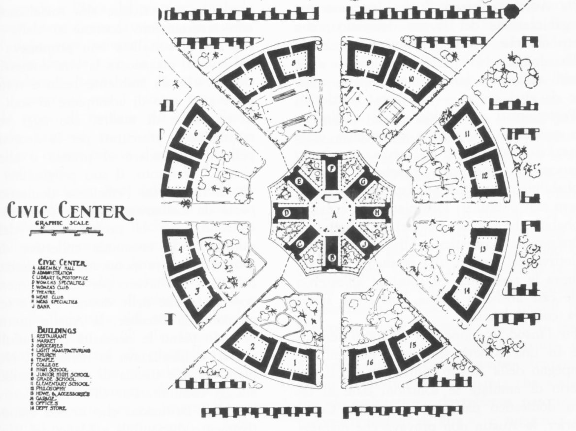 Il progetto consisteva in una pianta urbana circolare comprendente edifici amministrativi, ristoranti, chiese, scuole, mercati, ecc. Lo spirito (e la forma soprattutto) ricordava molto quello della città-giardino di Ebenezer Howard – per 30.000 abitanti su mille acri di terra – che la Austin conosceva, un modello di pianificazione urbanistica in cui i quartieri e gli isolati erano circondati da “cinture verdi” che contenevano aree proporzionate di residenze, industrie e agricoltura. L’idea inglese della Garden City nacque per risolvere il problema dell’aumento della popolazione nei centri urbani per lo sviluppo crescente delle industrie che aveva creato un forte degrado alle città nella seconda metà del XIX secolo. Per questa ragione due utopisti, il gallese Robert Owen (1771-1858) e il francese Charles Fourier (1772-1837), avevano contrapposto alla città reale una ideale dove le fabbriche avevano orari moderati e salari più alti, e avevano i servizi in comune fra i cittadini. L’idea fu ripresa e sviluppata da Howard che, in modo meno ideologizzato, si era prefisso come obiettivo prevalente quello di salvare la città dal congestionamento e la campagna dall’abbandono. La Garden City doveva essere costituita da un parco centrale attorno al quale si sarebbero sviluppate le aree residenziali a bassa densità servite da ampi viali puliti e una cinta ferroviaria che chiudeva l’intera città. Howard non considerava l’aspetto storico o formale della nuova città industriale, ma si concentrava su aspetti puramente sociali ed economici. Nel suo saggio A Peaceful Path to Real Reform del 1898 descrisse con rigore scientifico le quantità di terreno, unità abitative, tipologie di insediamenti produttivi e quant’altro potesse servire alla costituzione corretta di una Garden City; arrivò addirittura a citare, in maniera del tutto innovativa considerata l’epoca, il tema dello smaltimento dei rifiuti. Letchworth fu la prima città giardino realizzata in Europa nel 1903, a circa 50 km. da Londra. Questa distanza doveva garantire la creazione di una fascia verde con un duplice scopo: fornire tutto il necessario alla sopravvivenza dei cittadini e contenere l’espansione incontrollata della città stessa. Welwyn Garden City è stata la seconda città giardino, fondata negli anni Venti da Ebenezer Howard e progettata dall’architetto Louis de Soissons.